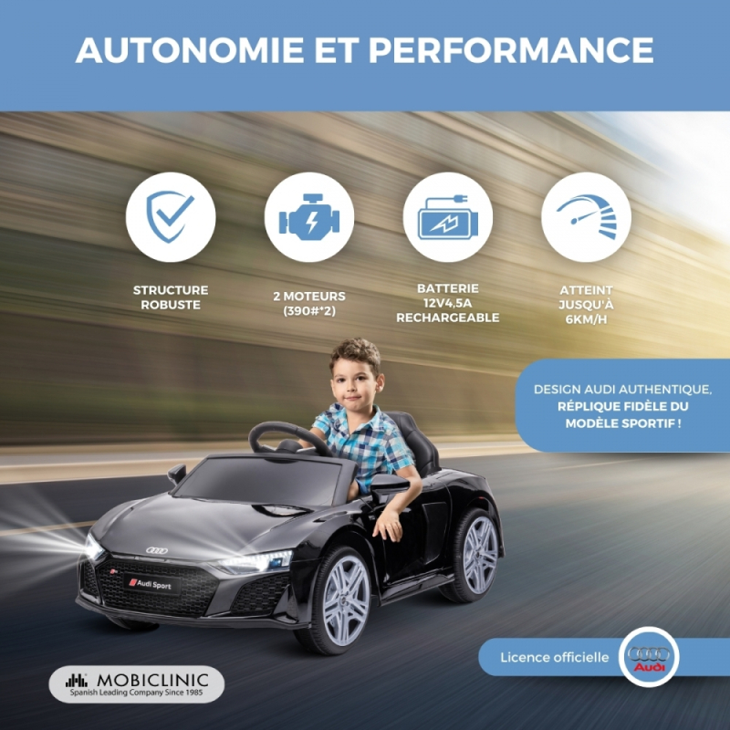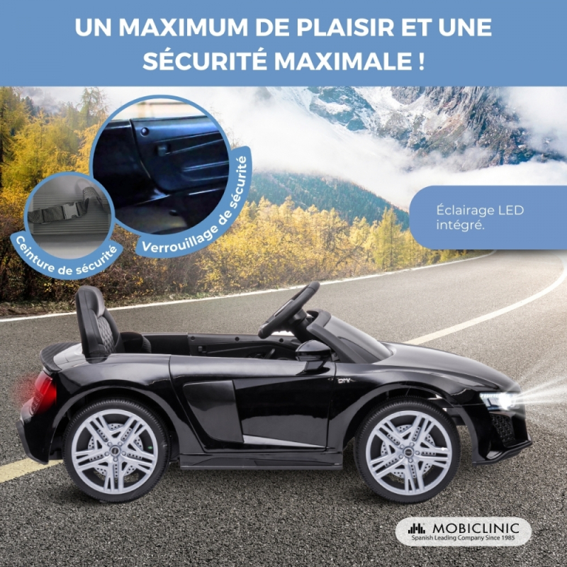 La voiture électrique MobiSporty, sous licence Audi R8 Spyder, est conçue pour offrir une expérience de conduite authentique et sûre aux plus petits. Avec des dimensions de 107 cm de long, 58 cm de large et 48 cm de haut, cette voiture électrique est parfaite pour les enfants entre 36 et 72 mois, offrant une manière ludique et éducative de développer la motricité et la coordination.