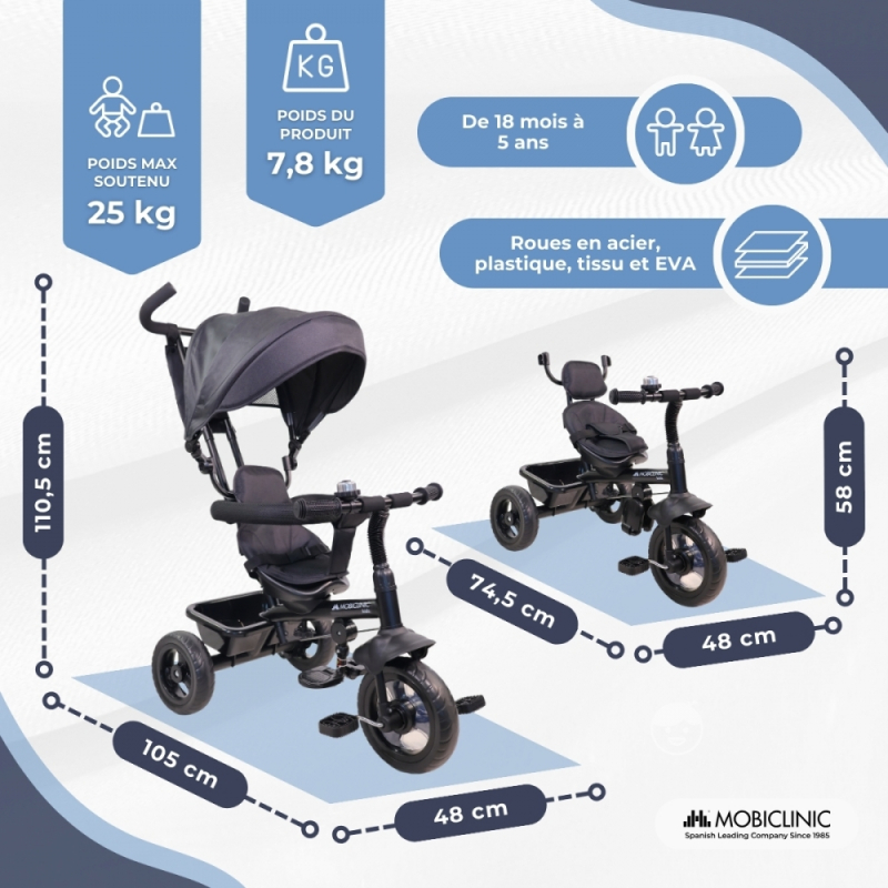 Mesurant 111 x 104 x 48 cm et pesant 7,5 kg , ce tricycle est fabriqué pour être résistant et en même temps facile à manipuler. Ce produit supporte un poids maximum de 25 kg par utilisateur.