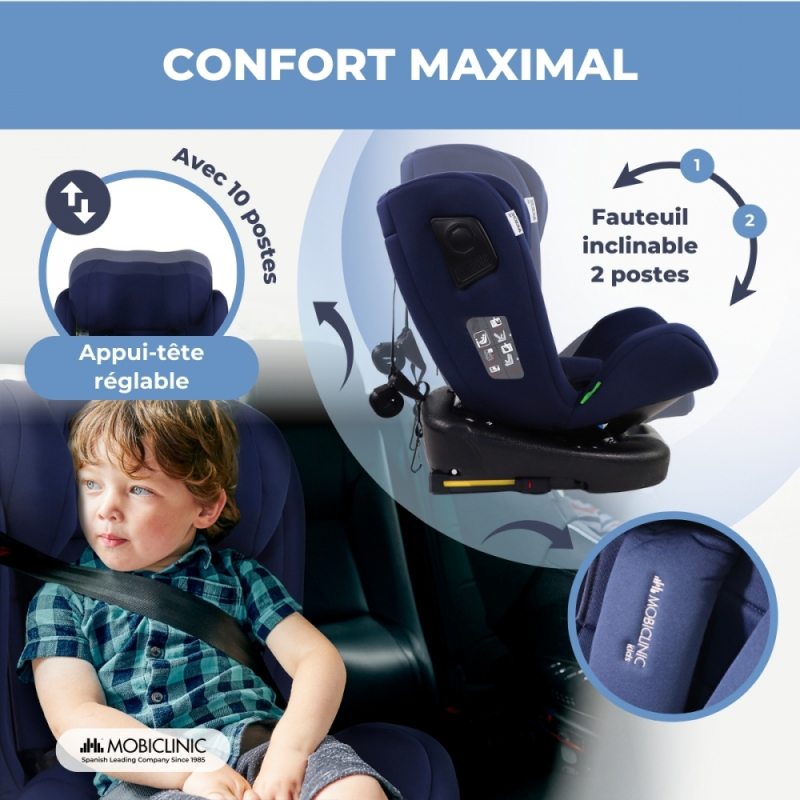 Siège auto pour enfant | Pivotant 360º | Inclinable | 40-150cm | 0-12ans | Top Tether | Réglable | Bleu | Pandafix | Mobiclinic