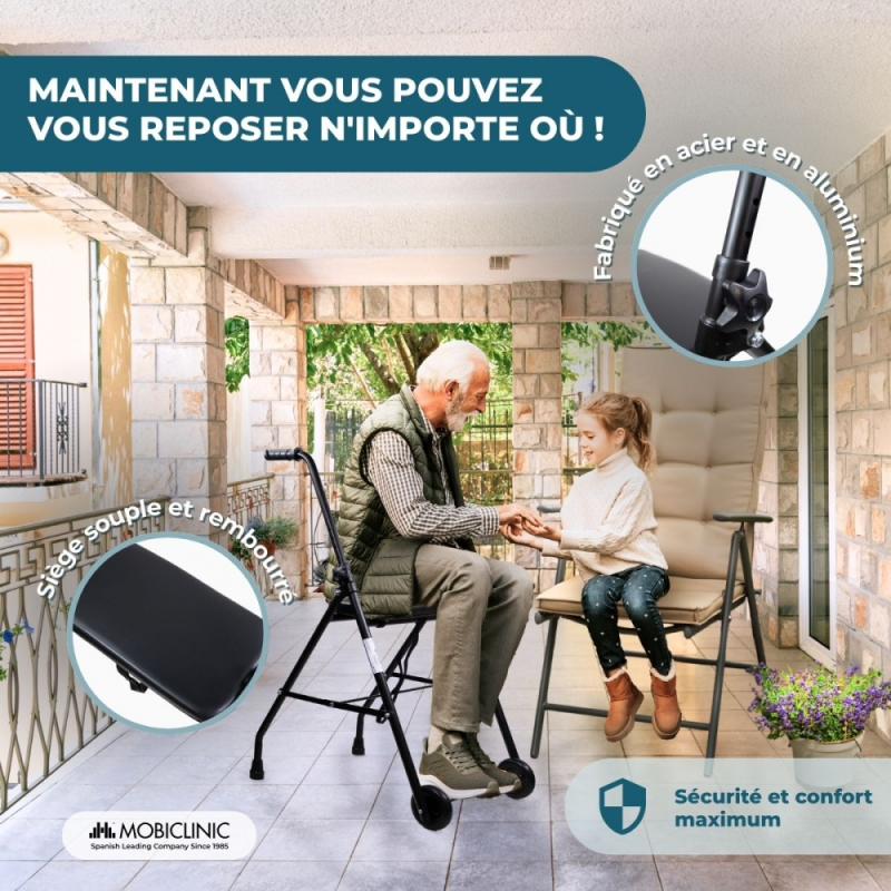 CONFORTABLE : Grâce à ses poignées anatomiques et à son siège rembourré en PVC, il constitue non seulement un déambulateur orthopédique confortable pour se déplacer, mais aussi pour se reposer.