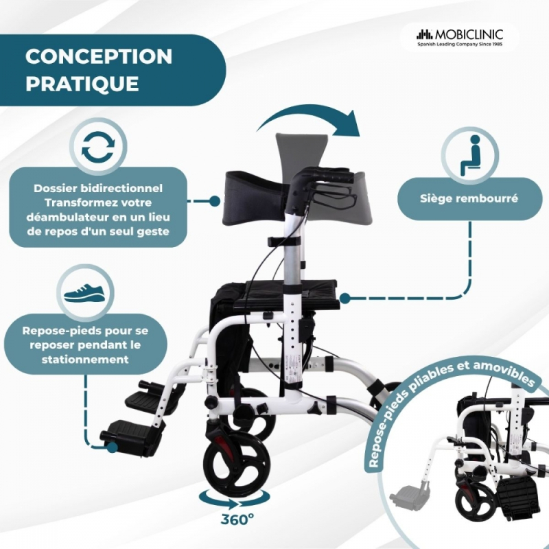 Il est doté d'une assise rembourrée et d'un dossier réversible pouvant être orienté vers l'avant ou vers l'arrière, offrant un soutien confortable lors des pauses. Ses repose-pieds réglables sur 5 positions permettent un repos des jambes sûr et pratique, toujours en complément de la détente et non en remplacement d'un fauteuil roulant.
