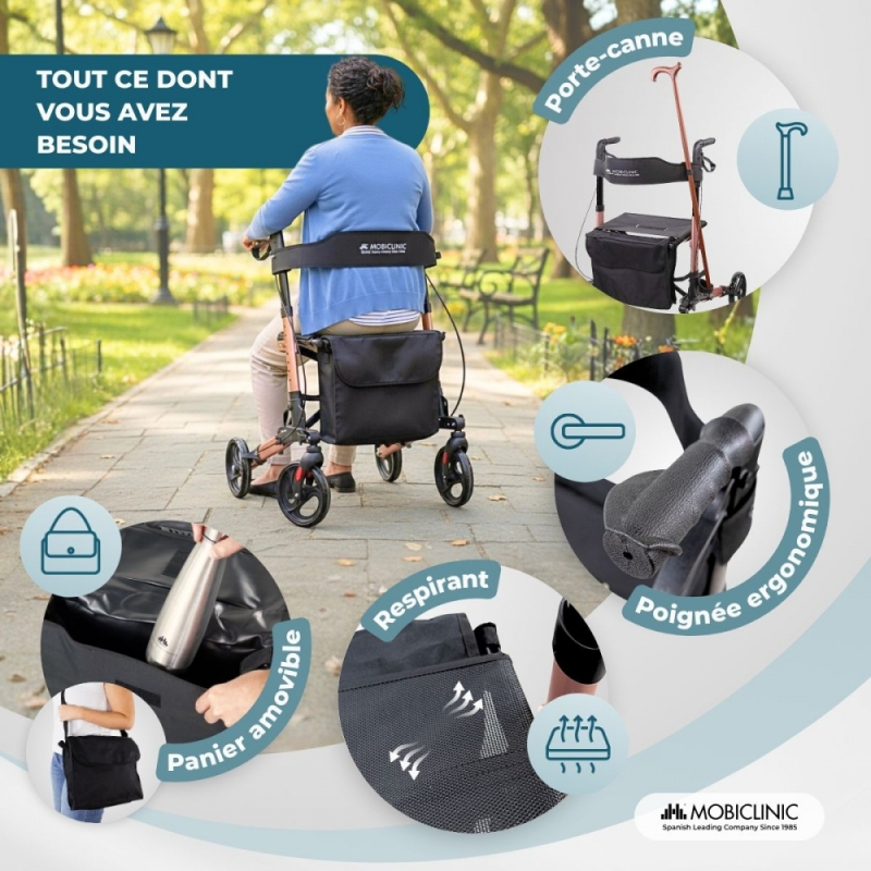 Déambulateur à 4 roues | Pliable | Aluminium | Freins sur leviers | Siège et dossier | Trajano | Deluxe | Mobiclinic