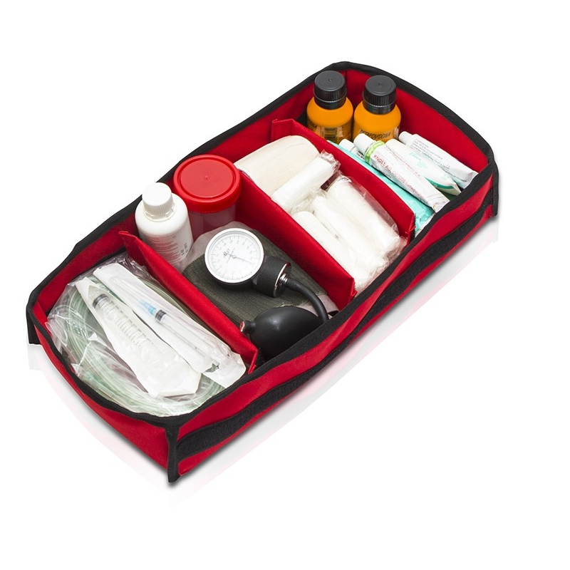 Sac d'urgence matelassé conçuu pour y mettre le matériel sanitaire lié à l'oxygénothérapie, divisé en 2 hauteurs à l'intérieur : plateau supérieur amovible avec séparatueurs réglables et partie inférieure avec 3 séparateurs pour y mettre la bouteille à oxygène. Dispose également de trois poches extérieures, deux à l'avant et un sous diaphanes divisé à l'intérieur avec des poches supplémentaires et des bandes élastiques.