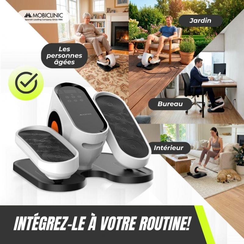 Le mini-elliptique Mobidal est conçu pour offrir un entraînement confortable et accessible à domicile, au bureau ou dans tout autre espace. C'est la solution idéale pour maintenir une activité physique quotidienne, améliorer sa mobilité et favoriser la circulation sanguine dans les articulations, sans impact.