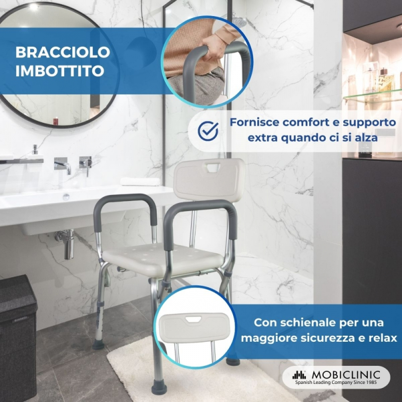 La sedia doccia per anziani e disabili, è dotata di braccioli imbottiti, per offrire il massimo comfort e sullo schienale è situata una maniglia, utile per sollevarla e trasportarla.