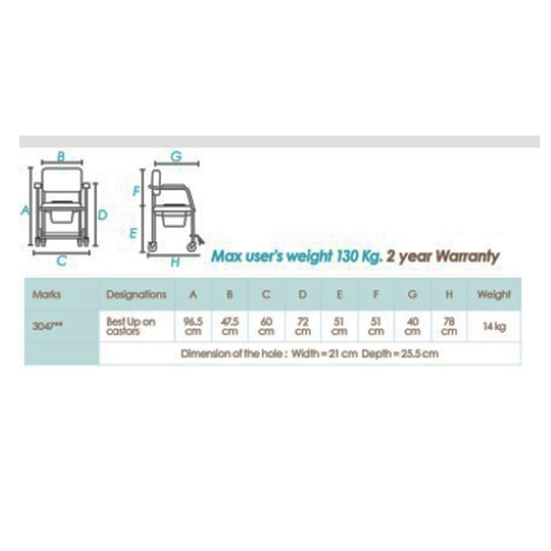 Il sedile imbottito di schiuma di 5 cm la rende confortevole per l'utente. Il sedile è fissato con un sistema a clip che consente una facile rimozione e una rapida pulizia. Il secchio può essere rimosso anche dai lati e dalla parte superiore. Il modello Best Up è dotato di braccioli e poggiapiedi pieghevoli per facilitare il trasferimento sicuro dei pazienti. È inoltre dotato di freni su due delle quattro ruote.