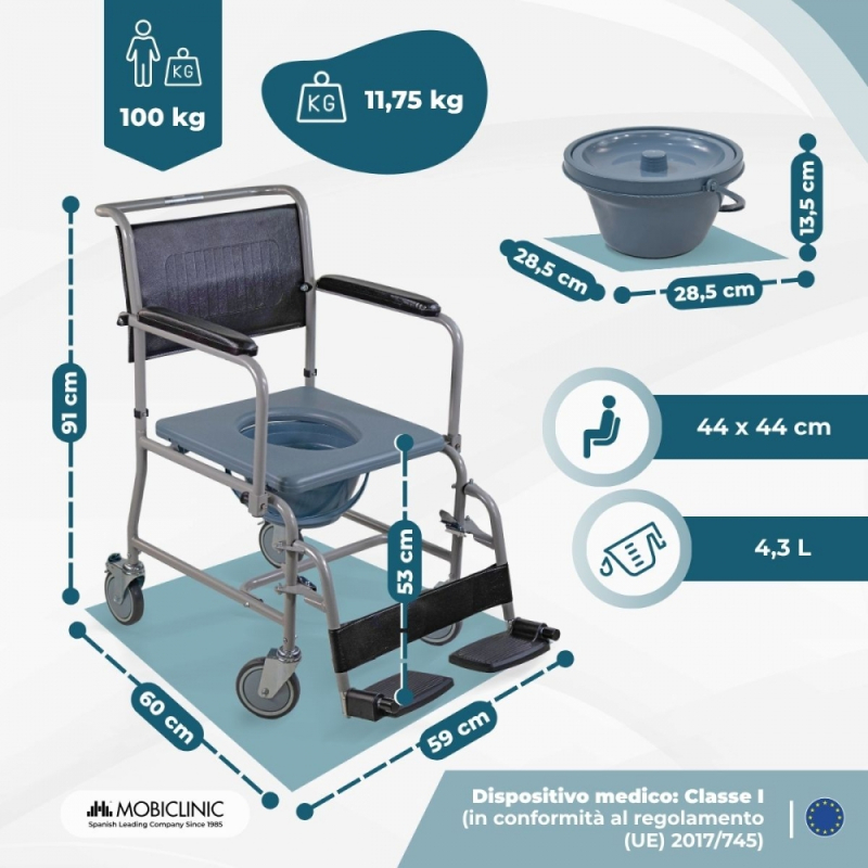 Sedia a rotelle con WC | Comoda wc |Braccioli pieghevoli | Poggiapiedi rimovibili | Grigio | Ancla | Mobiclinic