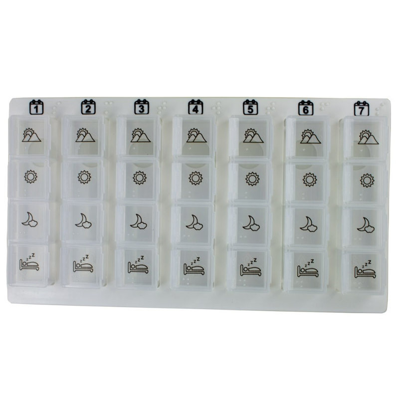 Per ogni giorno della settimana sono presenti 4 divisioni con l'icona di ogni momento del giorno, anche in formato braille. Corrispondono a colazione, pranzo, cena e notte ma si può adattare alle necessità di ogni paziente.