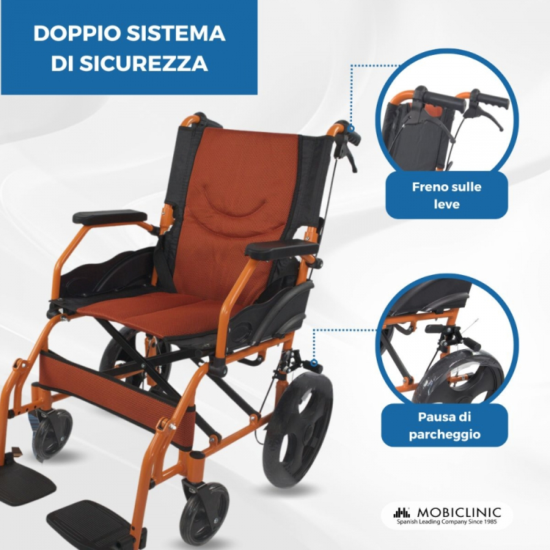 Sedia a rotelle pieghevole | Alluminio | Freno a leva | Poggiapiedi | Braccioli | Arancione | Piramide | Mobiclinic