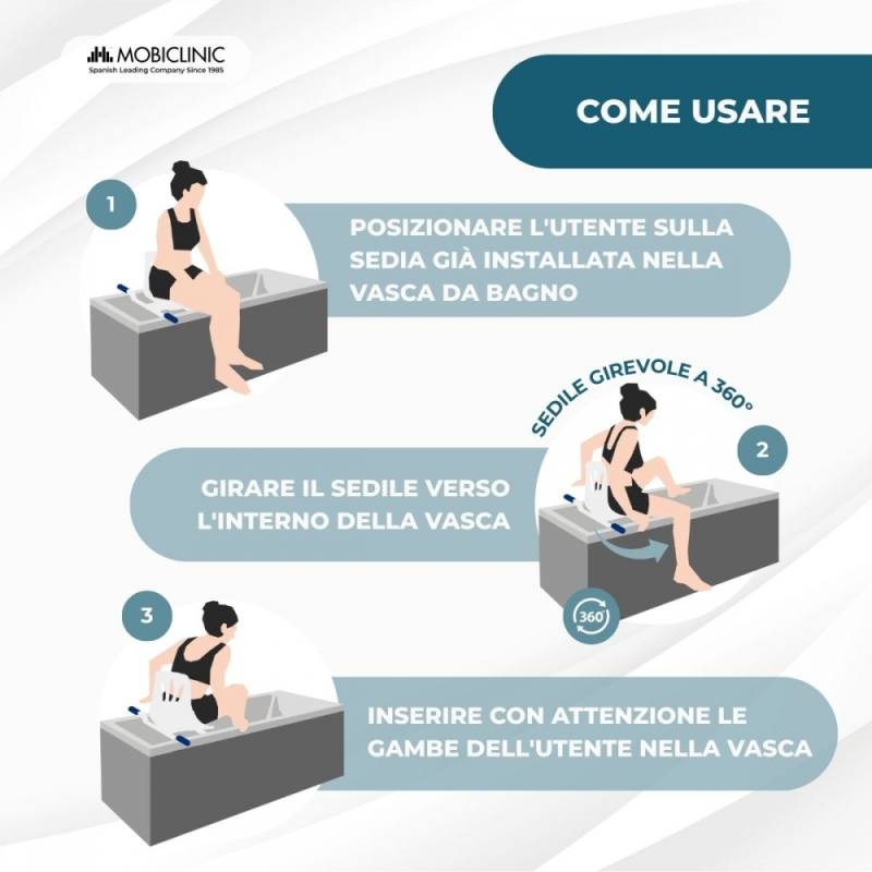È dotato di una seduta ergonomica e girevole che facilita l'igiene e semplifica il lavoro dell'assistente. È il mobile perfetto per le persone che non riescono a stare in piedi per lunghi periodi a causa di problemi circolatori, debolezza articolare o lesioni temporanee.