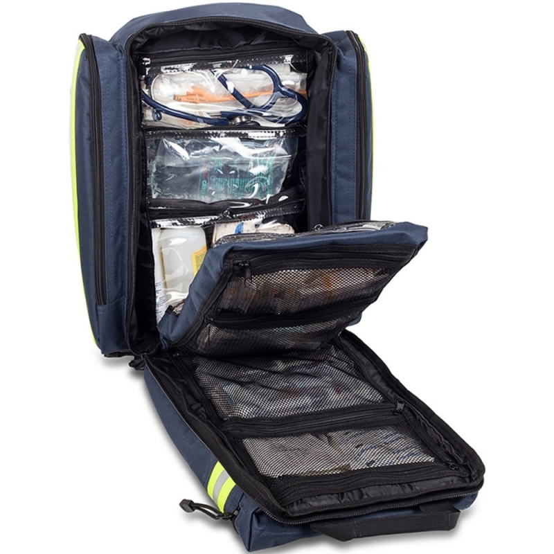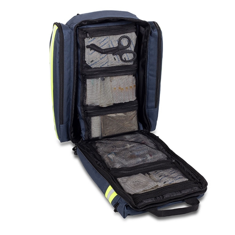 Gli zaini vitali per il salvataggio e l'emergenza supportano un intero kit di primo soccorso professionale e sono valigie di primo soccorso impermeabili ed ergonomiche, pratiche, leggere e ideali per riporre un intero kit di assistenza medica. Le caratteristiche principali dello zaino di emergenza Advanced Life Support (ALS) sono le seguenti: ha un'apertura a ribalta che permette un accesso rapido e facile a tutti gli strumenti necessari, tasche laterali e interne che permettono un'ottima organizzazione, e un pannello posteriore imbottito che lo rende comodo da trasportare e facile da tenere. Questo zaino di salvataggio blu per le emergenze mediche, ha all'interno separatori interni trasparenti di diverse dimensioni, che si adattano alle esigenze e alle misure che una squadra di primo soccorso richiede. Si tratta di una borsa da lavoro medica di emergenza impermeabile, utile e sicura per situazioni critiche, che per le sue dimensioni e caratteristiche diventa una delle più complete sul mercato. Le situazioni critiche possono verificarsi in qualsiasi momento della giornata e da qualsiasi luogo, quindi le linee fluorescenti della borsa blu per kit di emergenza garantiscono la visibilità in situazioni di emergenza notturna o critica. Caratteristiche dello zaino di emergenza: Dimensioni del corpo principale: 37 x 45 x 21 cm Volume totale: 29,75 L Materiale: poliestere 600D con rivestimento in PVC. Peso: 1,22 Kg Maniglia principale ergonomica con chiusura in velcro. Grandi tasche laterali su entrambi i lati. Spallacci dello zaino imbottiti e regolabili. Imbottitura posteriore imbottita. Grande tasca frontale preparata per ospitare il defibrillatore. Interno pieghevole per un accesso facile e veloce agli strumenti all'interno. Scomparti interni in rete con finestra trasparente. Copertura impermeabile all'interno della base. NON INCLUDE L'ATTREZZATURA MEDICA Questo zaino di salvataggio ci piace per: Il suo spazio: con un volume di quasi 30 litri, perfetto per riporre tutta l'attrezzatura medica. Il suo comfort: con schienale e spallacci imbottiti. Le sue tasche multiple: che offrono una grande quantità di spazio che migliorano l'organizzazione in modo significativ