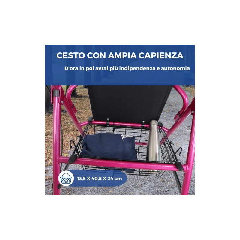 Questo deambulatore in alluminio è dotato di seduta e schienale imbottiti per garantire comfort e sicurezza, nonché un adeguato riposo dopo lo sforzo. Include un cestino progettato per riporre gli oggetti in modo sicuro e confortevole mentre cammini, potrai riporli sia sotto il sedile che nella parte anteriore del girello.