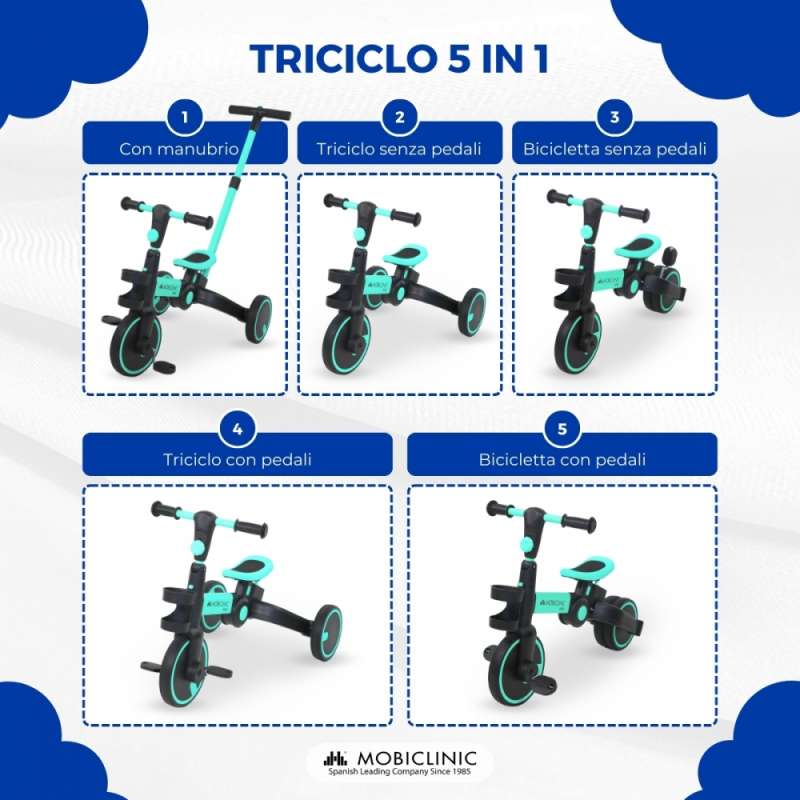 Triciclo 5 in 1 | Convertibile | Regolabile | Max 25 kg | Leggero | 1,5-5 anni | Blu | Chase | Mobiclinic