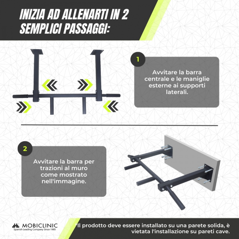 Il kit di montaggio incluso consente di regolare l'altezza della barra al livello desiderato, adattandola a diverse esigenze e tipologie di esercizi. Il suo design compatto e robusto garantisce una facile installazione su qualsiasi parete della casa.