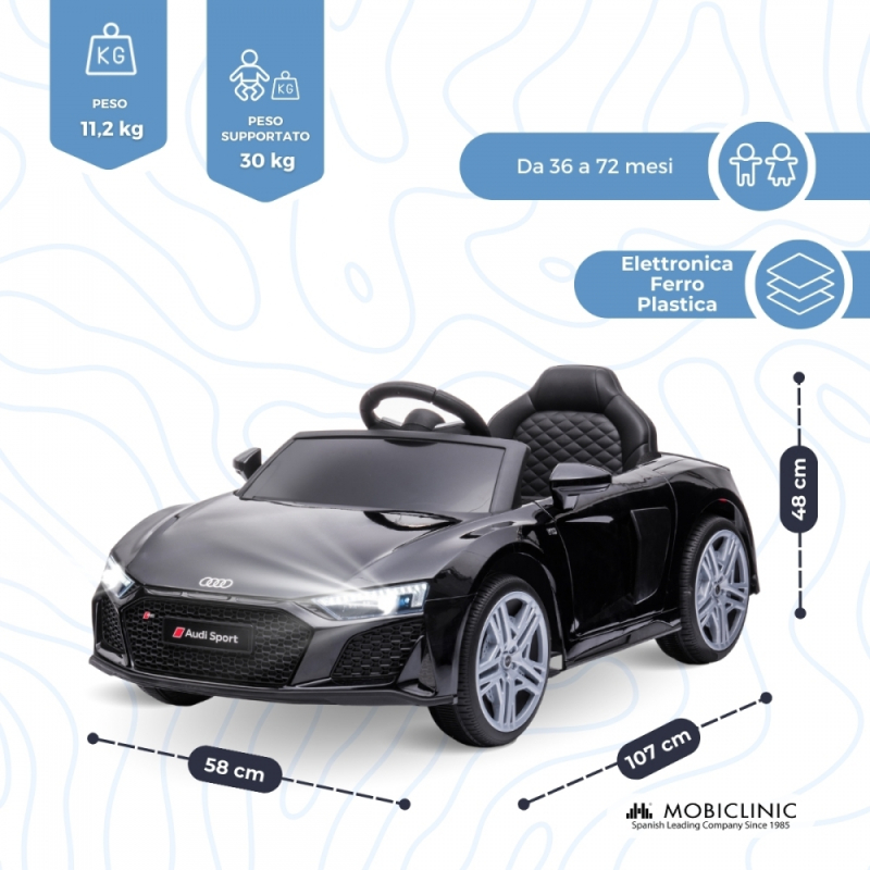 L'auto elettrica MobiSporty, con licenza Audi R8 Spyder, è progettata per offrire un'esperienza di guida autentica e sicura per i più piccoli. Con dimensioni di 107 cm di lunghezza, 58 cm di larghezza e 48 cm di altezza, questa auto elettrica è perfetta per i bambini di età compresa tra 36 e 72 mesi, offrendo un modo divertente ed educativo per sviluppare le capacità motorie e la coordinazione.