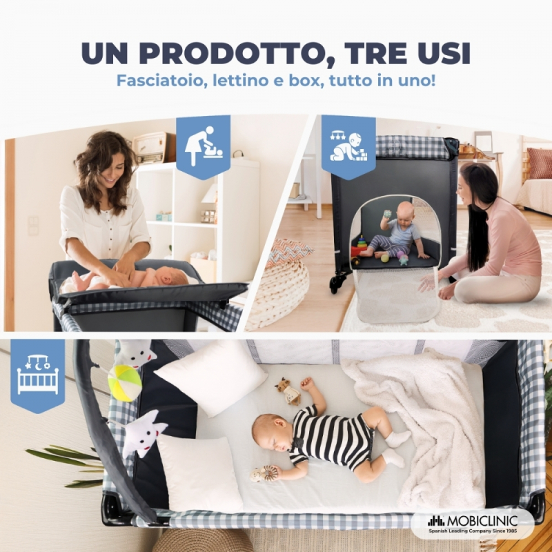 Il lettino da viaggio Caelum è la soluzione ideale per le famiglie che cercano comodità e versatilità nella vita quotidiana. Perfetto sia per la casa che per i viaggi. Grazie al suo design 3 in 1, combina le funzioni di fasciatoio, lettino da viaggio e box, adattandosi alle esigenze del bambino in ogni situazione.