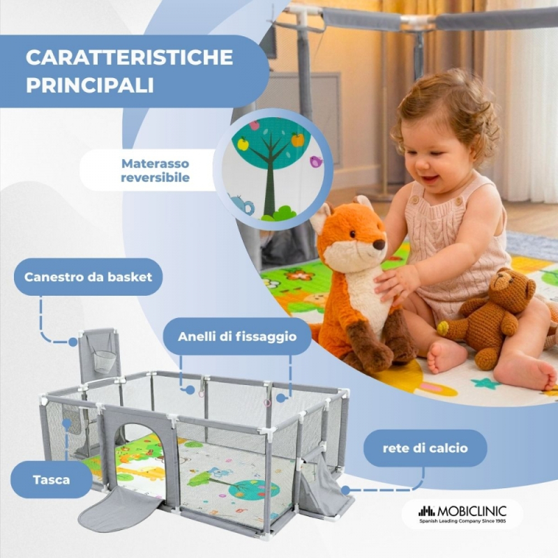 Parco giochi per bambini | Tappeto | 128x233cm | Anelli | Canestro e rete da calcio | Borsa per il trasporto | Mobiclinic