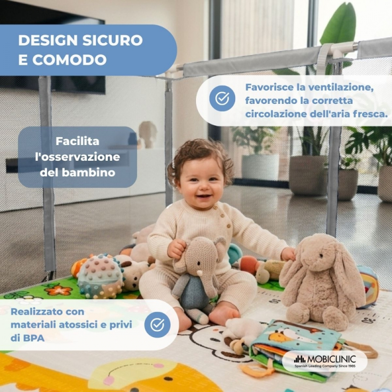 Per favorire l'indipendenza e la coordinazione dei più piccoli, il box è dotato di quattro anelli di sicurezza progettati per aiutarli a imparare a stare in piedi in modo graduale e sicuro. Le pareti in rete traspirante permettono ai genitori di monitorare il bambino in ogni momento e garantiscono anche una ventilazione costante.