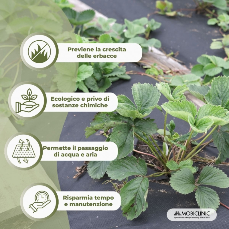 Il suo tessuto traspirante e permeabile consente il passaggio di acqua e aria, contribuendo a mantenere l'umidità del terreno senza compromettere l'irrigazione regolare. È anche resistente ai raggi UV, il che gli consente di sopportare la luce solare diretta senza deteriorarsi. È facile da installare e può essere tagliato con le forbici per adattarlo a diverse dimensioni, secondo necessità.