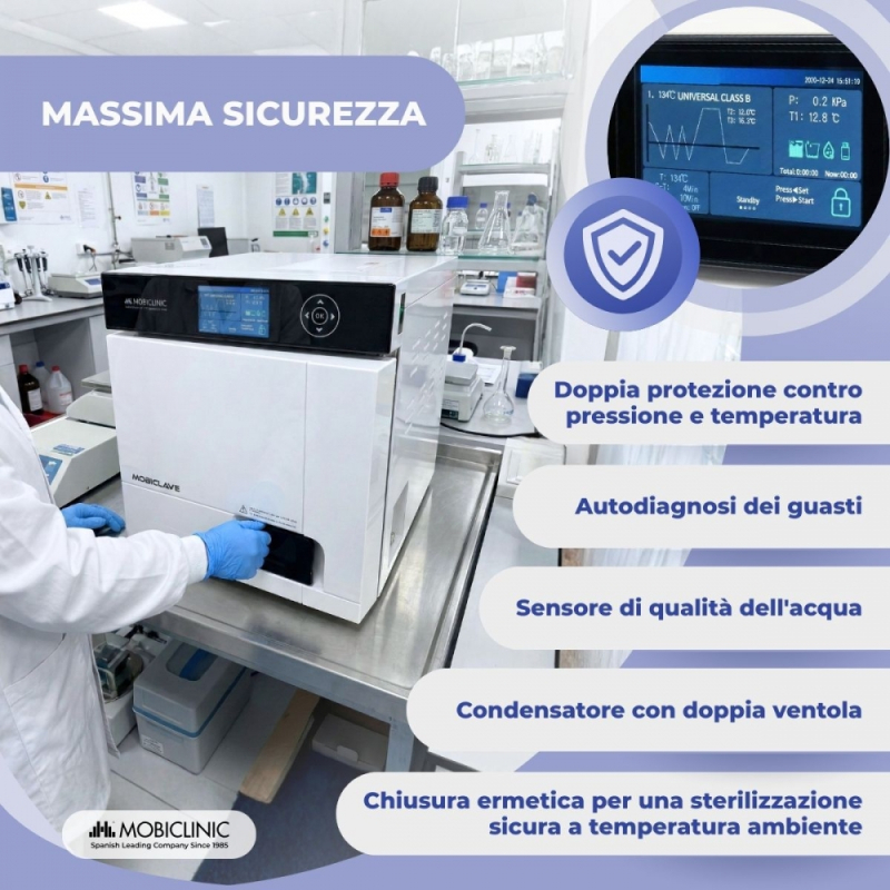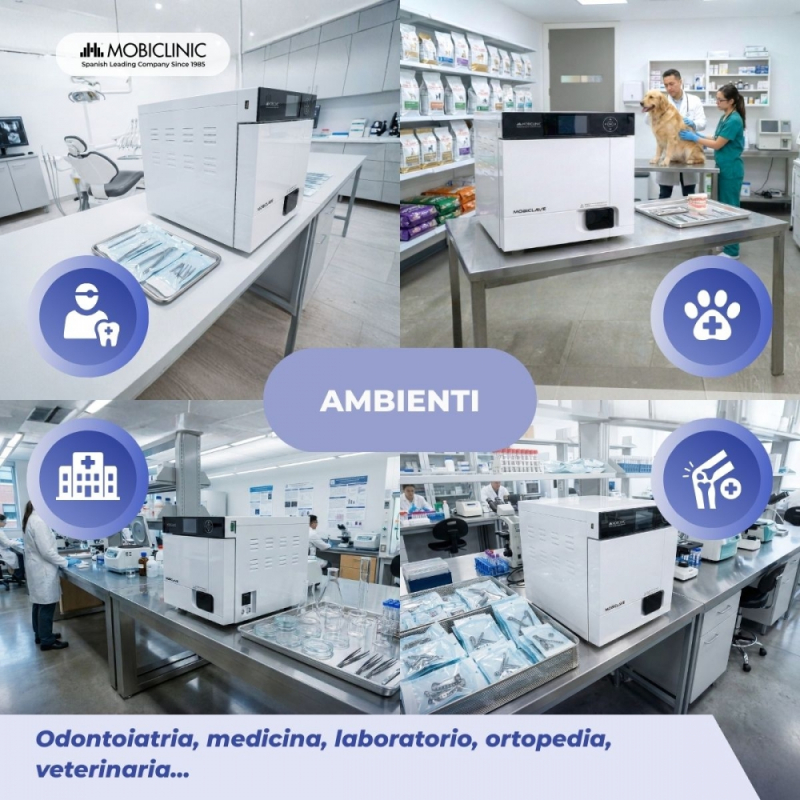 L' autoclave sterilizzante Mobiclinic da 17 litri è progettata per offrire una sterilizzazione completa, professionale e sicura, adattandosi alle esigenze di molteplici settori quali cliniche odontoiatriche, centri medici, laboratori, ortopedia o cliniche veterinarie.