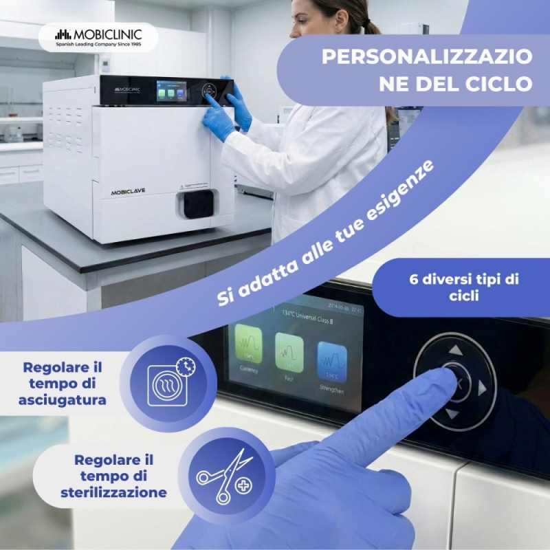 PROGRAMMI PERSONALIZZABILI E IMPOSTAZIONI MULTI-CICLO: Dispone di 6 cicli di sterilizzazione preimpostati e della possibilità di personalizzare la durata di asciugatura e sterilizzazione in base alla tipologia di strumenti. Permette inoltre di programmare l'avvio del ciclo per ottimizzare i tempi.