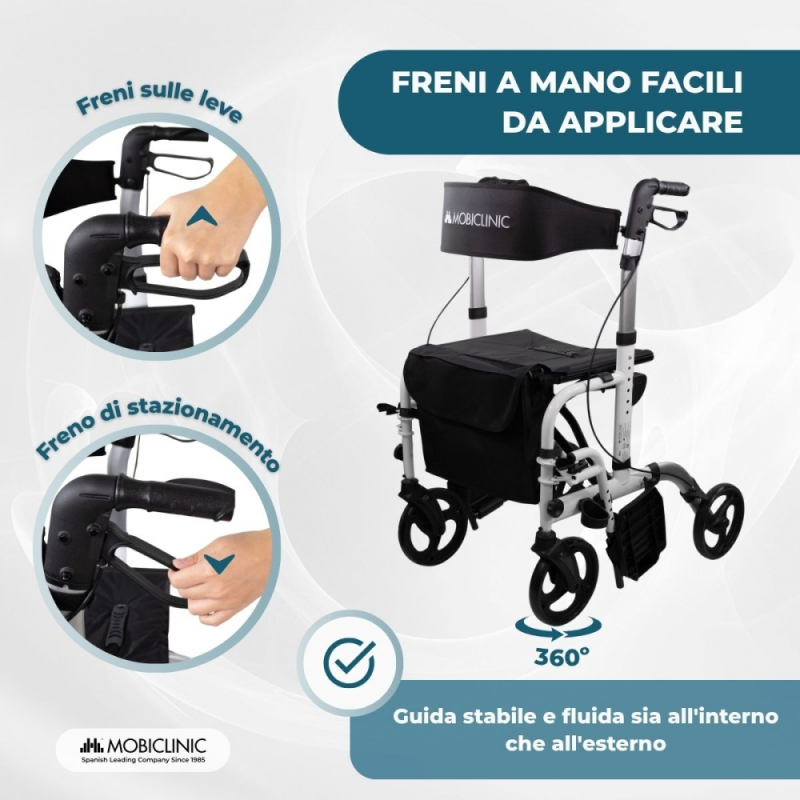 La sicurezza è garantita dal telaio in alluminio leggero ma robusto , in grado di supportare fino a 136 kg. Inoltre, i freni a mano integrati nelle maniglie sono facili da azionare, anche per chi ha poca forza nelle mani, garantendo sicurezza in ogni utilizzo.