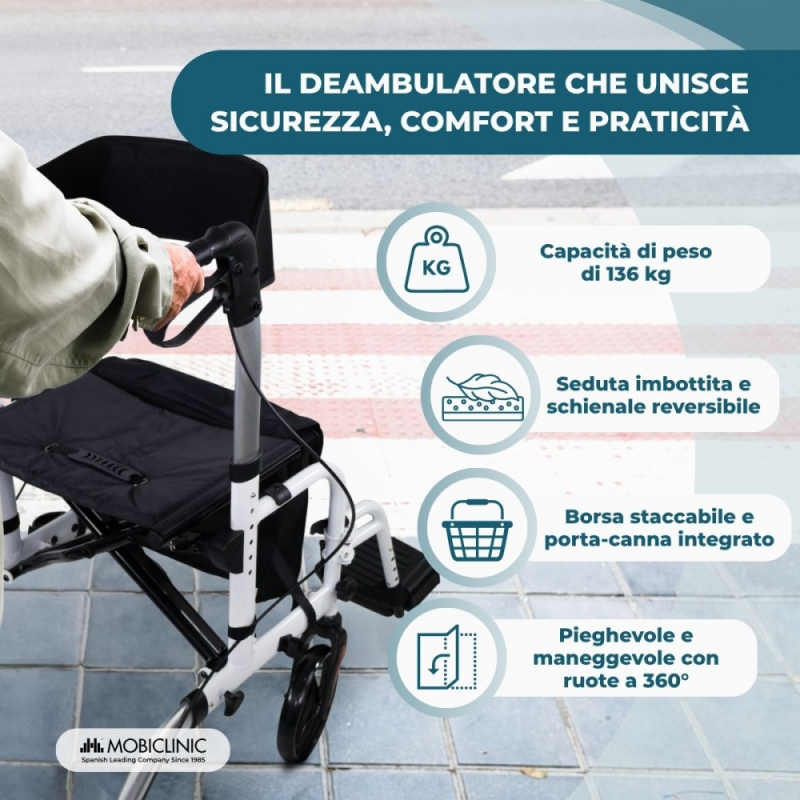 Come ulteriore vantaggio, include una borsa per la spesa staccabile realizzata in resistente tessuto Oxford, perfetta per trasportare i propri effetti personali, e un porta-bastone integrato che rende la vita di tutti i giorni ancora più semplice.