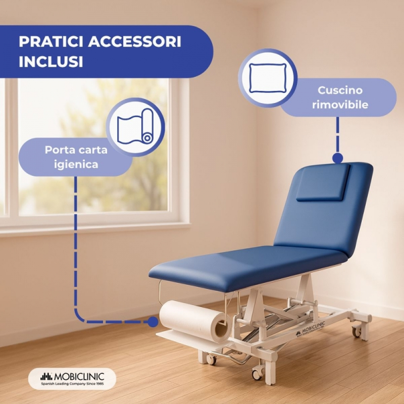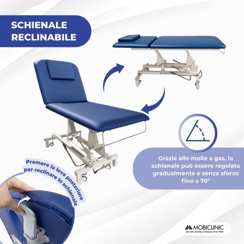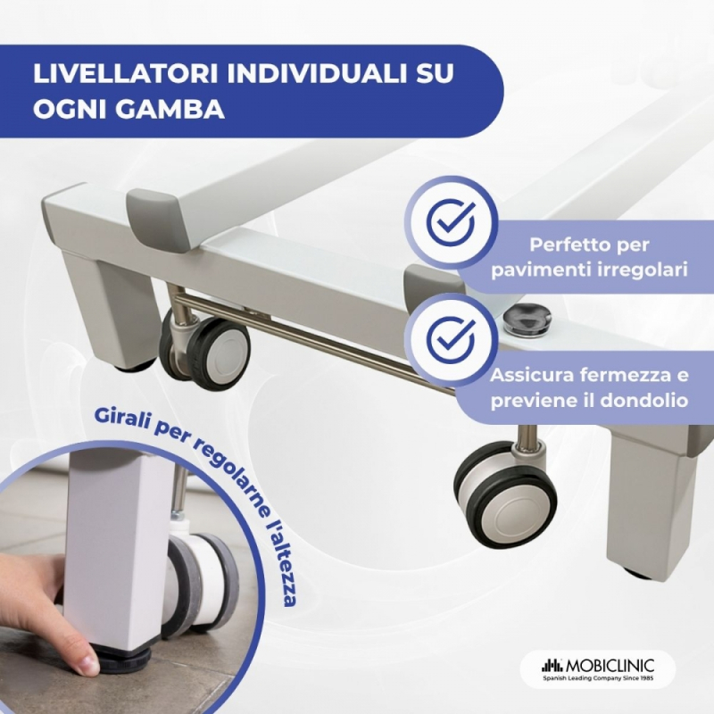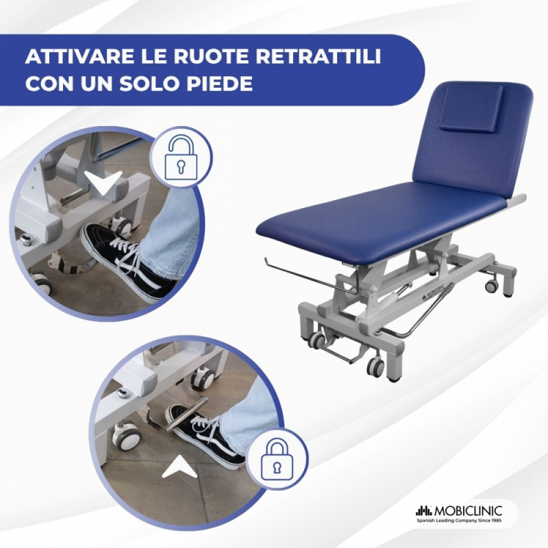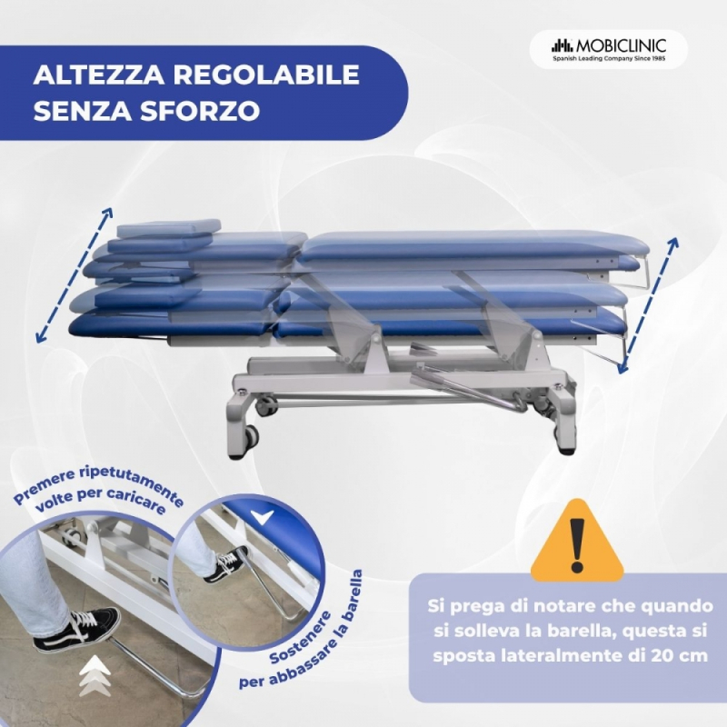 Barella idraulica | Altezza regolabile | Schienale reclinabile | Foro per il viso | Ruote retrattili | Livellatori | Mobiclinic