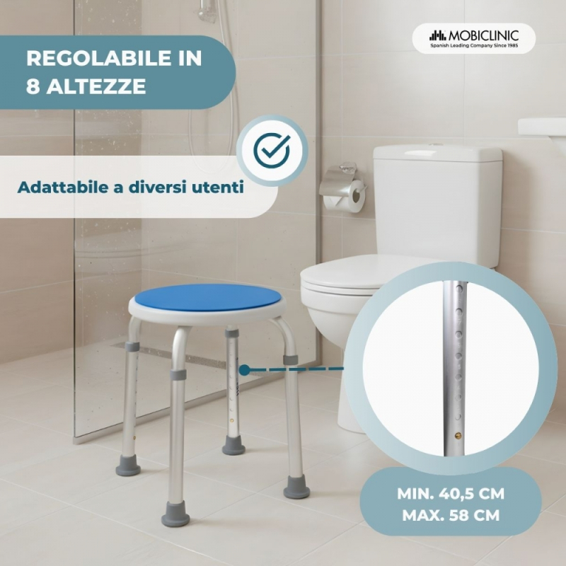 Sgabello da bagno | Altezza regolabile | Max 100 Kg | Puntali e superficie antiscivolo in EVA | Foco | Mobiclinic