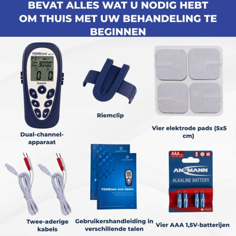 De programma's zelf zijn zeer veelzijdig en je kunt de presets gemakkelijk gebruiken of je eigen aanpassingen maken. De TENS Eco Basic maakt hoogfrequente en laagfrequente behandelingen en dynamische stimulatie mogelijk. Evenals stimulatie met puur positieve stroompulsen (monofasisch). Daarnaast zijn ook iontoforese en zenuwblokkades mogelijk. Dit maakt het praktische TENS-apparaat de juiste keuze voor zowel patiënten als medische professionals.