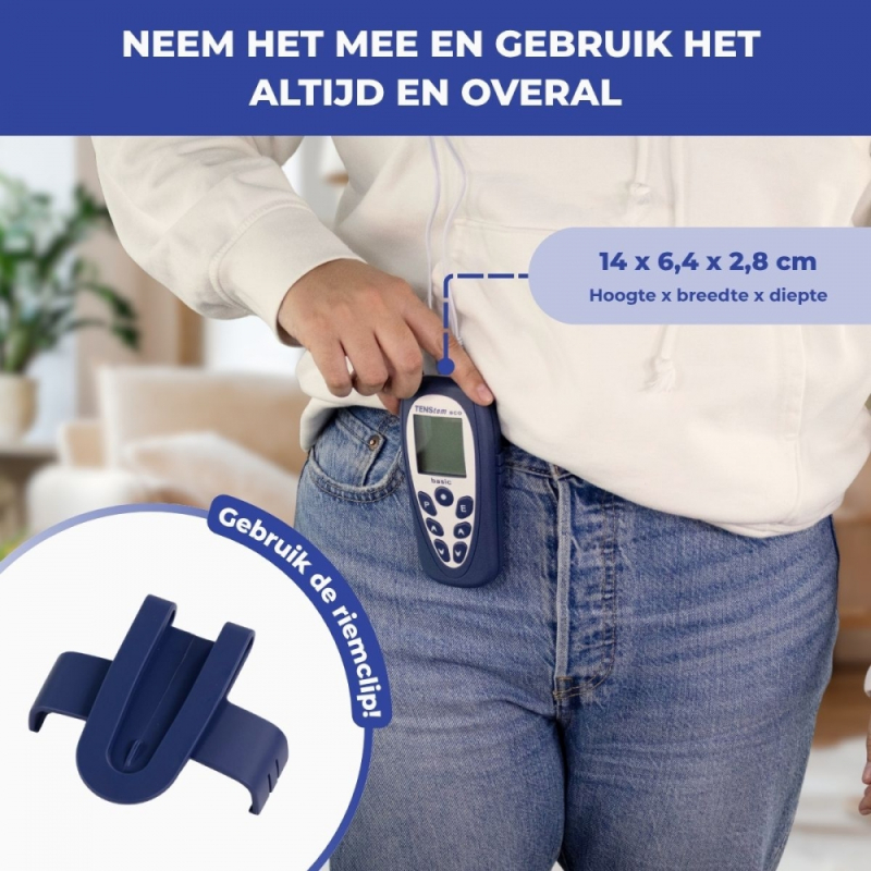 DRAAGBAAR: door het kleine formaat en het bevestigingssysteem aan kleding kun je overal en altijd genieten van de voordelen van de therapie die je nodig hebt. De elektrostimulator is praktisch en past overal