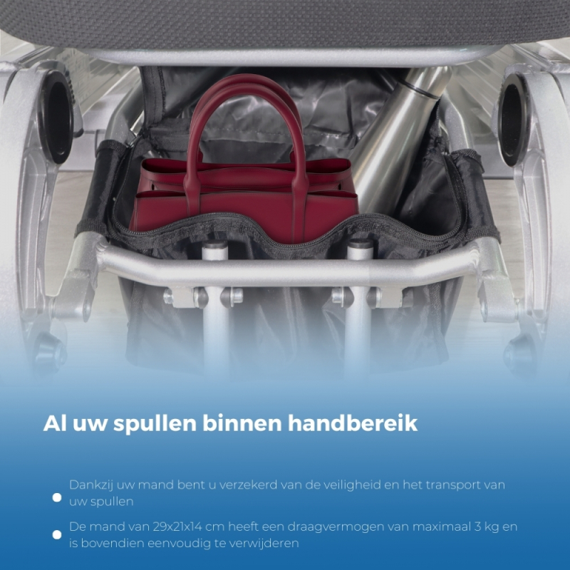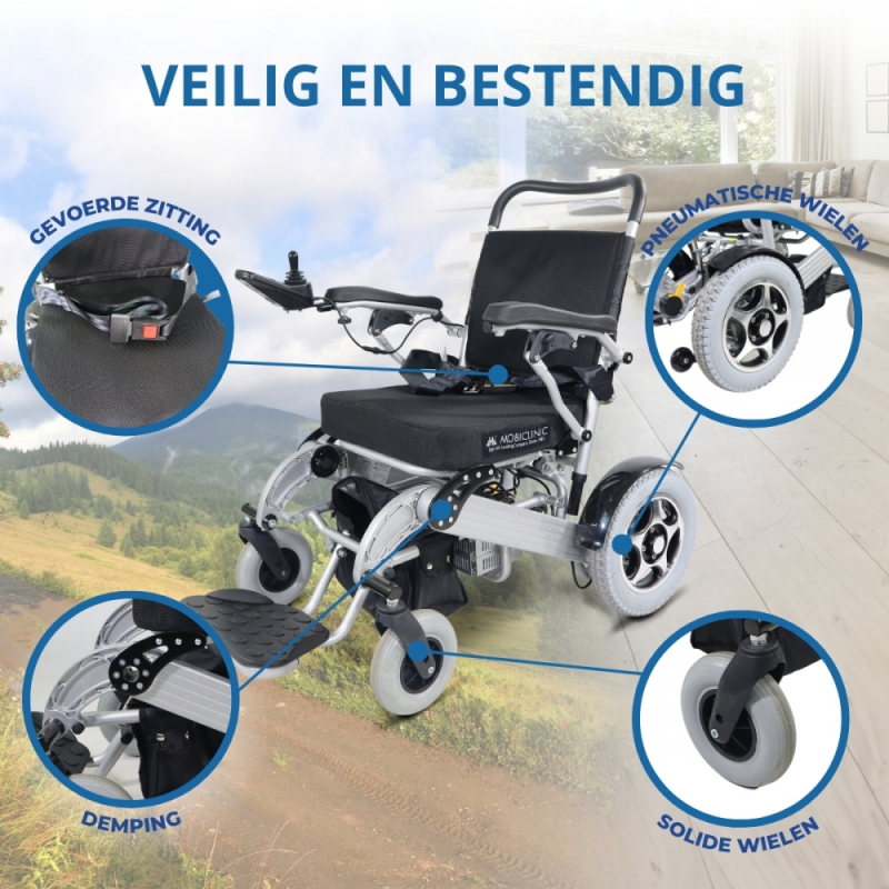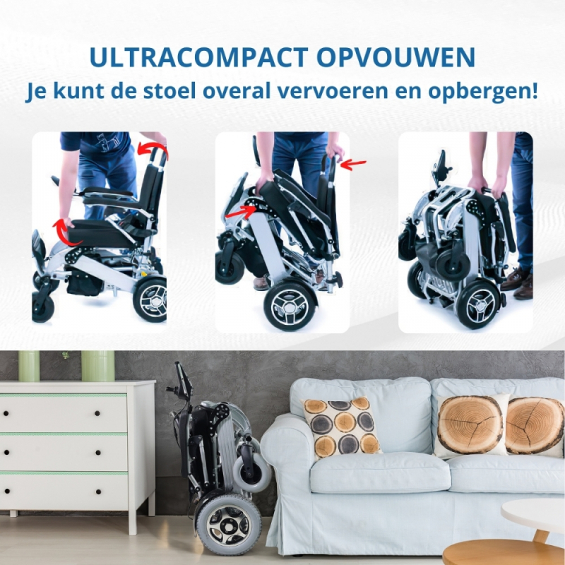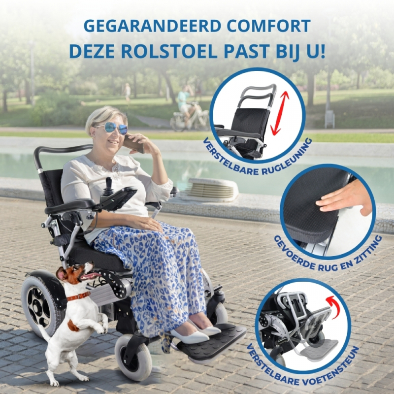 Toegankelijk: Het totale gewicht van deze elektrische rolstoel (zonder accu's) is 24,8 kg. Bovendien kan dit model een maximaal gewicht tot 120 kg dragen.