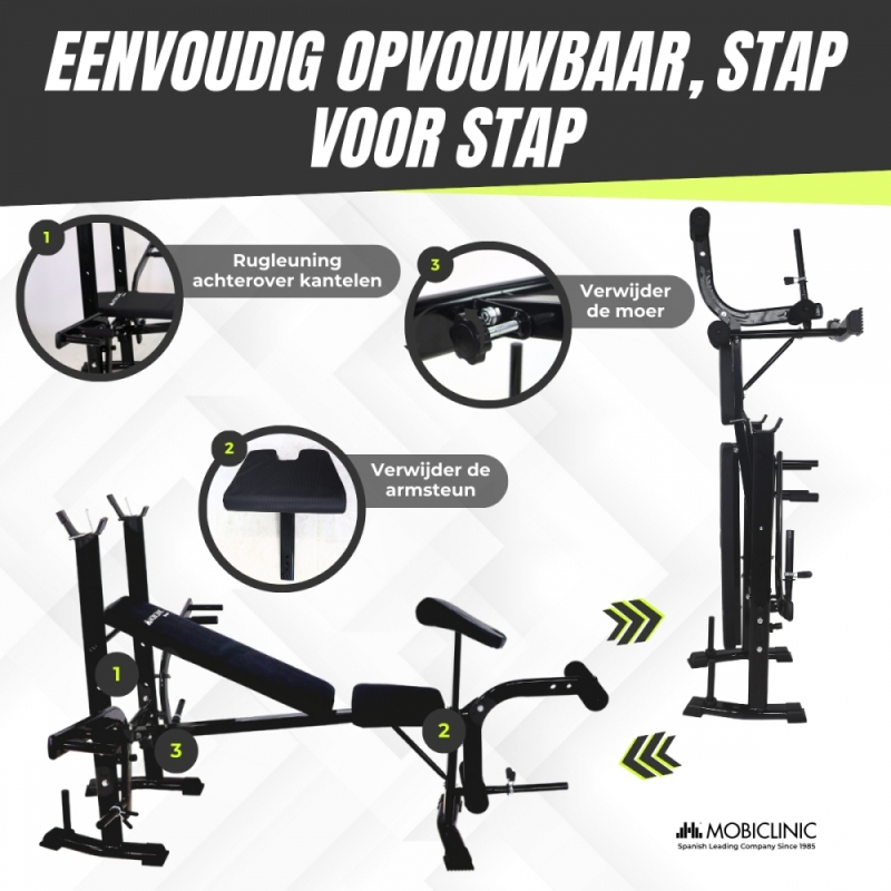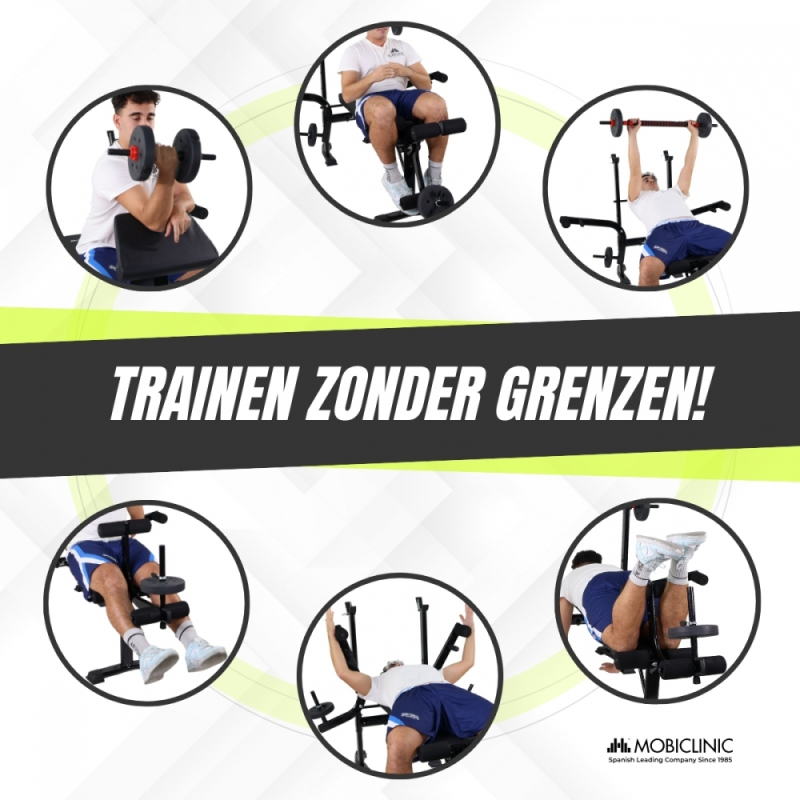 Multifunctionele halterbank | Opvouwbaar | Verstelbaar | Staafsteun | 148x180x110,5cm | 250kg | Pressfit | Mobiclinic