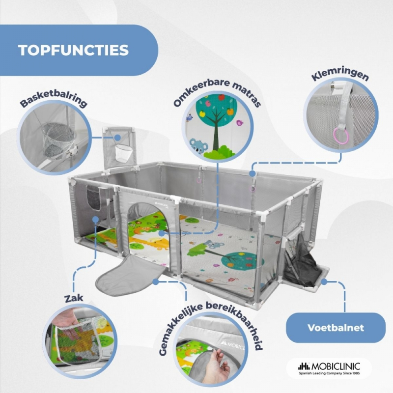 Dankzij de afmetingen van 128 x 233 cm biedt het een ruime en comfortabele speelplek waar kleintjes veilig kunnen kruipen, staan, spelen of hun eerste stapjes kunnen oefenen. De meegeleverde mat biedt bovendien een zachte ondergrond die de vloer isoleert en de speel- of rustervaring verbetert.