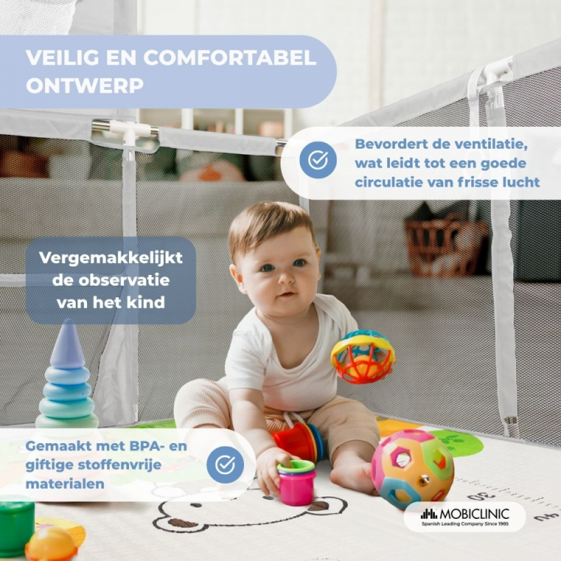 Om de onafhankelijkheid en coördinatie van de kleintjes te stimuleren, is de box voorzien van vier veiligheidsringen die hen helpen geleidelijk en veilig te leren staan. De ademende gaaswanden zorgen ervoor dat ouders hun baby te allen tijde in de gaten kunnen houden en zorgen voor constante ventilatie.