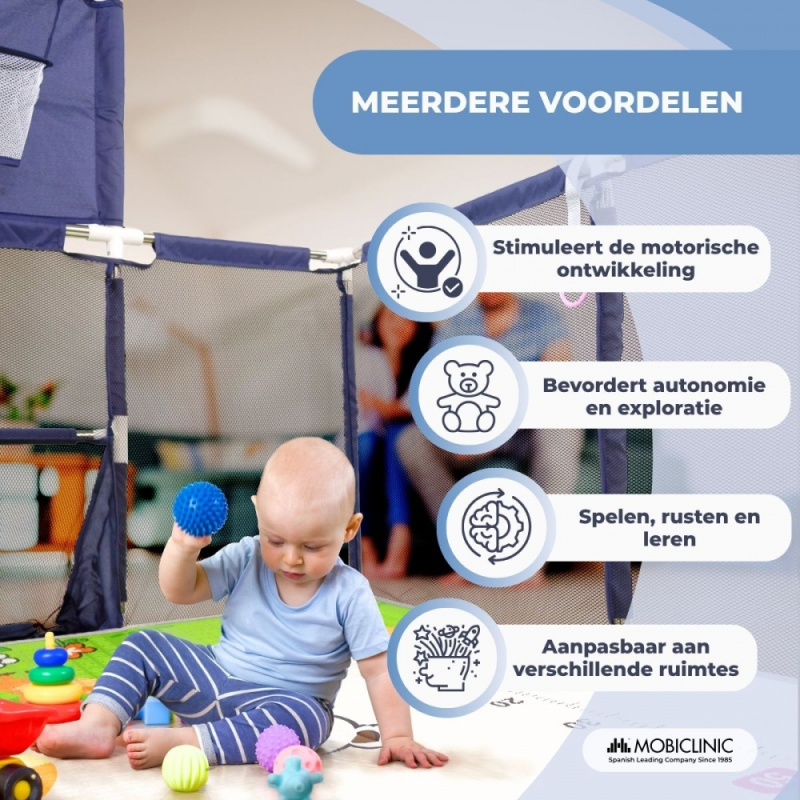 Om de onafhankelijkheid en coördinatie van de kleintjes te stimuleren, is de box voorzien van vier veiligheidsringen die hen helpen geleidelijk en veilig te leren staan. De ademende gaaswanden zorgen ervoor dat ouders hun baby te allen tijde in de gaten kunnen houden en zorgen voor constante ventilatie.