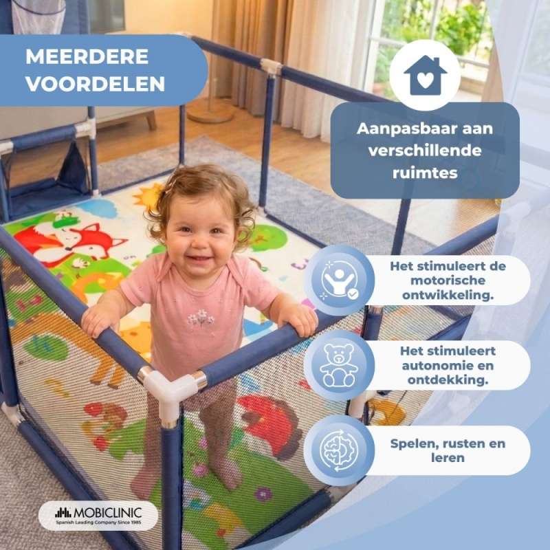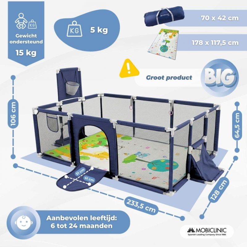 Dankzij de afmetingen van 128 x 233 cm biedt het een ruime en comfortabele speelruimte waar je kleintje veilig kan kruipen, staan, spelen of zijn eerste stapjes kan oefenen. De meegeleverde mat biedt bovendien een zachte ondergrond die de vloer isoleert en de speel- of rustervaring verbetert.