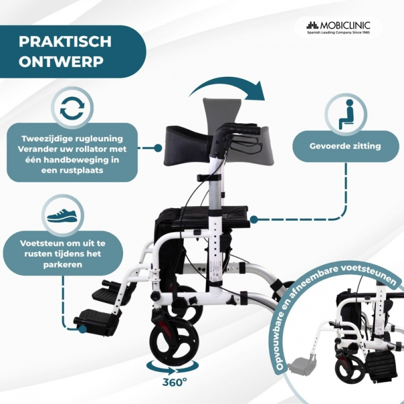 Het beschikt over een gewatteerde zitting en een omkeerbare rugleuning die naar voren of naar achteren kan worden gericht, voor comfortabele ondersteuning tijdens pauzes. De in 5 standen verstelbare voetsteunen bieden een veilige en praktische beensteun, altijd als aanvulling op ontspanning en niet als vervanging van het gebruik van een rolstoel.