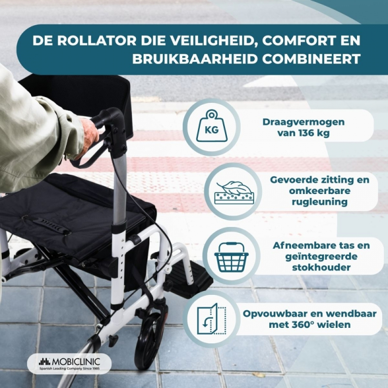 Als extraatje wordt de tas geleverd met een afneembare boodschappentas van duurzaam Oxford-materiaal, perfect voor het meenemen van spullen, en een geïntegreerde wandelstokhouder die het dagelijks leven nog gemakkelijker maakt.