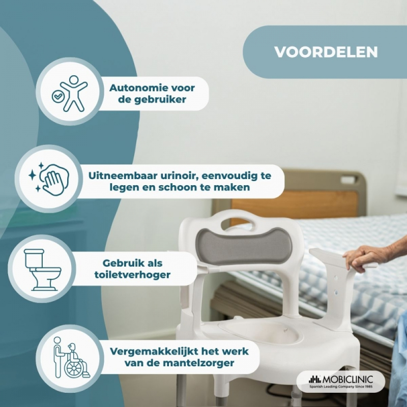 INBEGREPEN URINOIR: Deze stoel is voorzien van een uitneembaar urinoir dat tot 6 kg kan dragen en een inhoud heeft tot 3500 ml, wat de gebruiker een grote autonomie biedt. Het urinoir is zeer eenvoudig te verwijderen, waardoor het schoonmaken eenvoudiger wordt en de stoel altijd hygiënisch blijft.