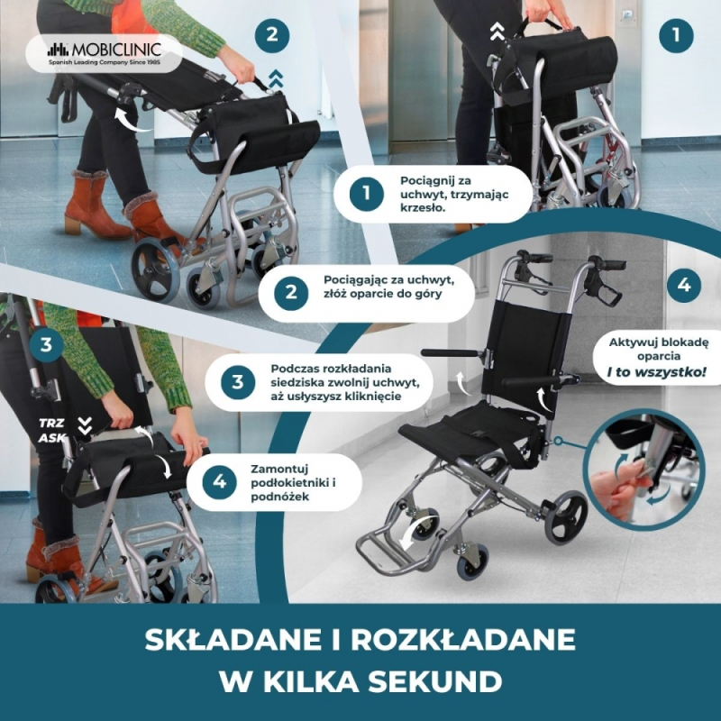 SKŁADANY: Ten składany wózek inwalidzki wykonany jest z aluminium, co zapewnia łatwe przemieszczanie bez utraty stabilności w żadnym momencie.
