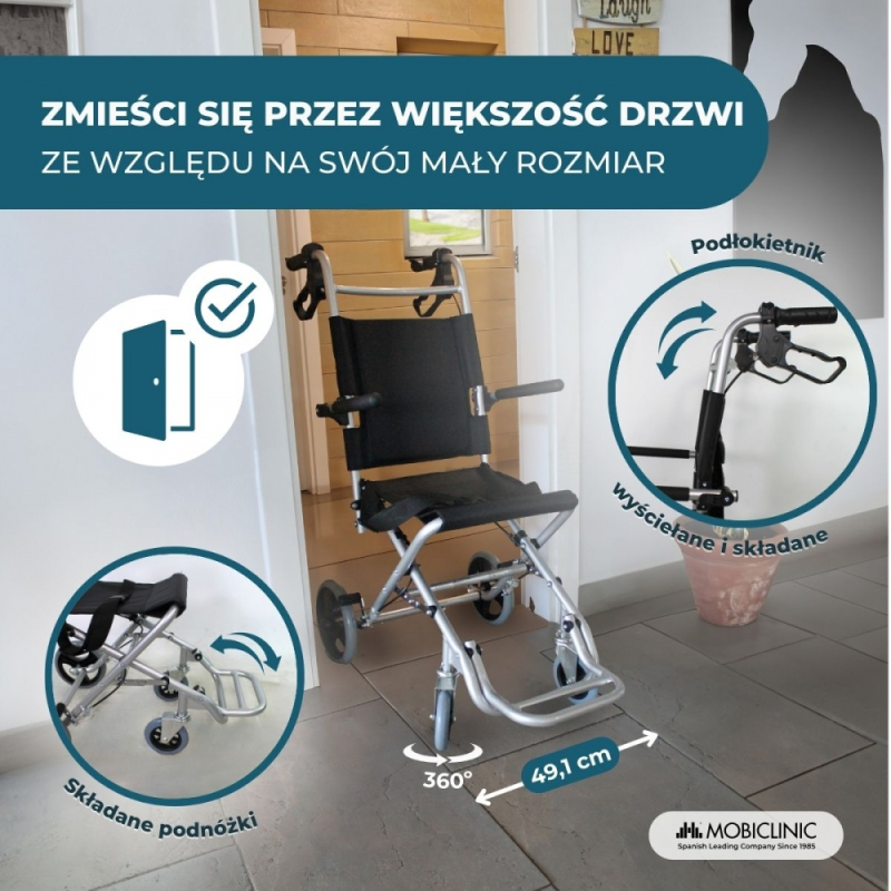 DRZWI I BAGAŻNIK : Ten wózek inwalidzki ma całkowitą szerokość 49,1 cm, dzięki czemu może przejechać przez drzwi o standardowej szerokości 62,5 cm. Ponadto, ponieważ po złożeniu krzesło ma długość zaledwie 31 cm, można je przewozić w bagażniku samochodu typu Ford Focus. Zmierz dokładnie drzwi i pojazd, aby mieć pewność, że będą pasować.