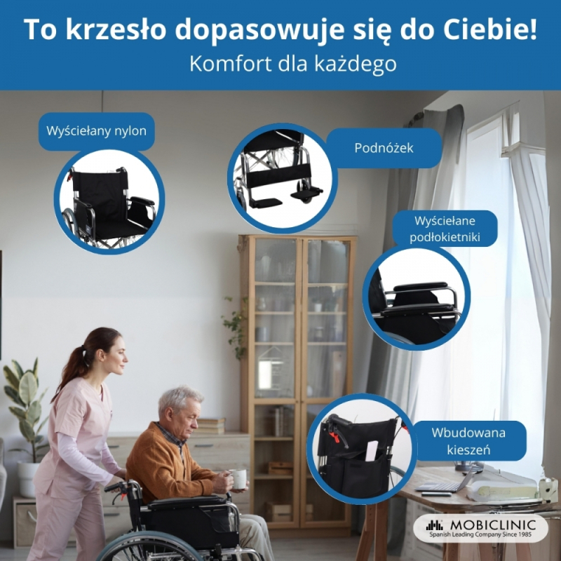 Cechą szczególną tego wąskiego wózka inwalidzkiego jest system składania, dzięki któremu można przejechać przez wąskie miejsca i szybko go później rozłożyć. Przechowując go, zaoszczędzisz także miejsce w domu. Ten składany wózek inwalidzki jest idealny dla osób, które chodzą lub poruszają się z trudnością, a także dla osób, które właśnie przeszły operację lub dla osób starszych.