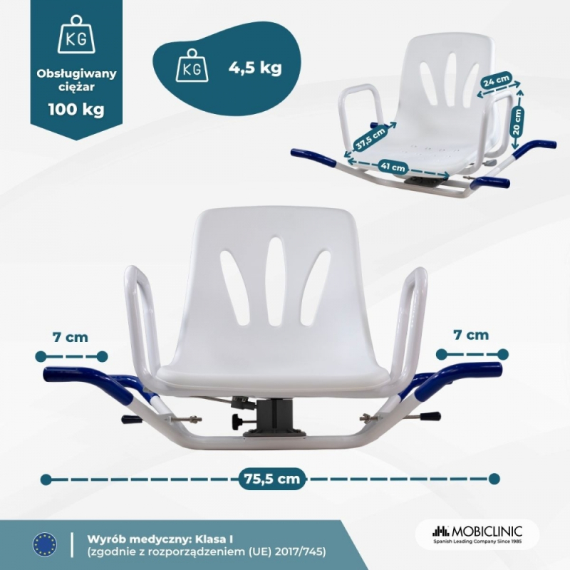 posiada wyprofilowane siedzenie i obracany, aby ułatwić higienę i zadania opiekuna. Jest to idealne meble dla osób, które nie może stać długo na zaburzenia krążenia, osłabienie w stawach lub czasowego urazu