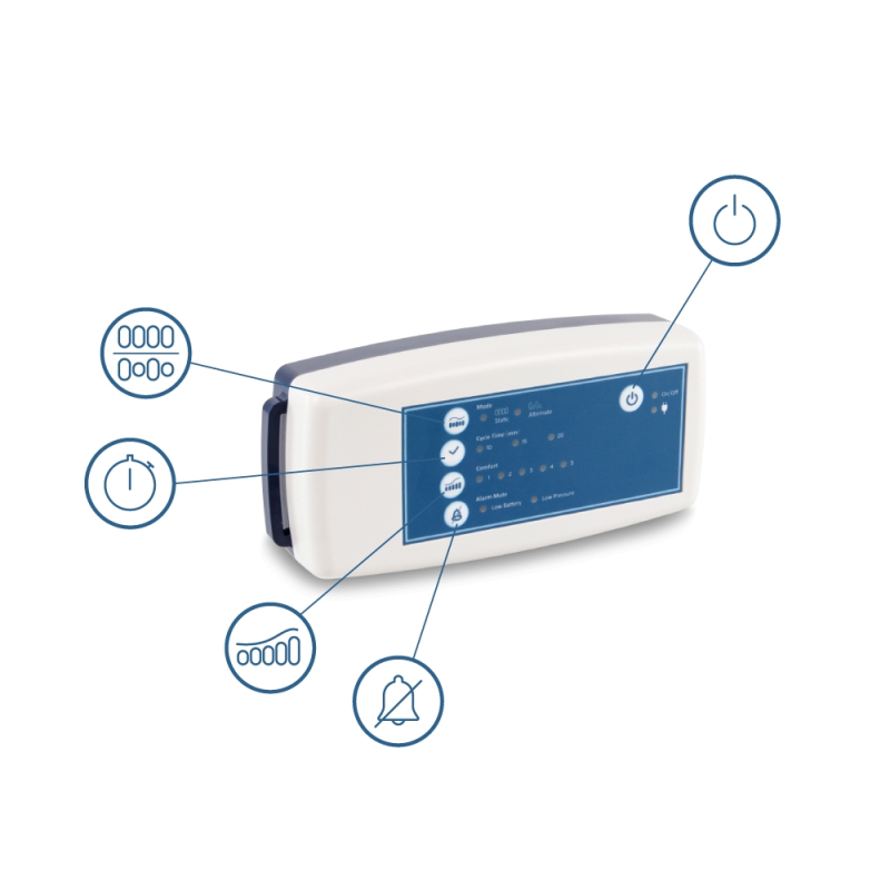 Ich komórki mogą być przełączane ciśnienia, dzięki sprężarce poleceń w tym z pokrywą do transportu. Sprężarka jest łatwy w użyciu, może być regulowane w pięciu różnych trybach zmiennego ciśnienia dla komfortu pacjenta. Posiada system alarmowy obniżone ciśnienie i niski poziom naładowania baterii.