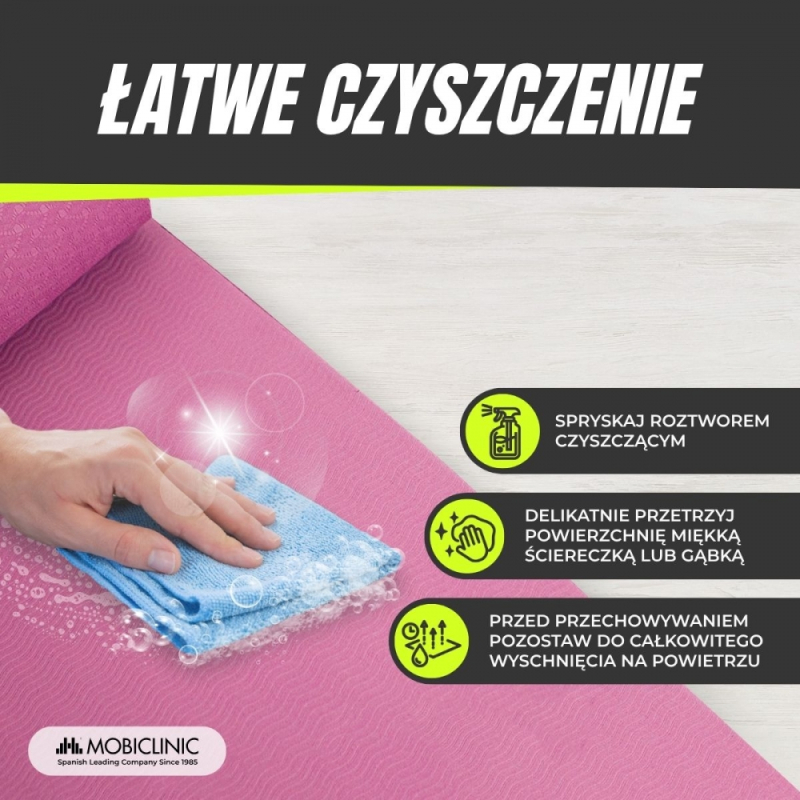 ŁATWE W CZYSZCZENIU: Po zakończeniu ćwiczeń matę można bardzo łatwo umyć, ponieważ wystarczy ją wyczyścić ściereczką nasączoną wodą z mydłem, a następnie wytrzeć i na koniec osuszyć suchą szmatką. W ten sposób możesz zachować swoją matę jak pierwszego dnia.