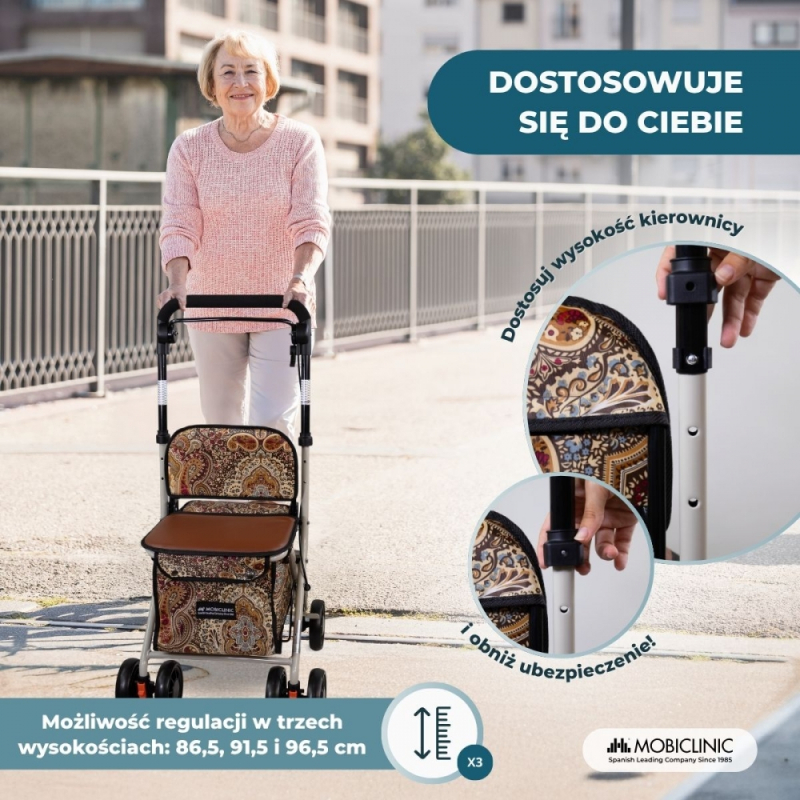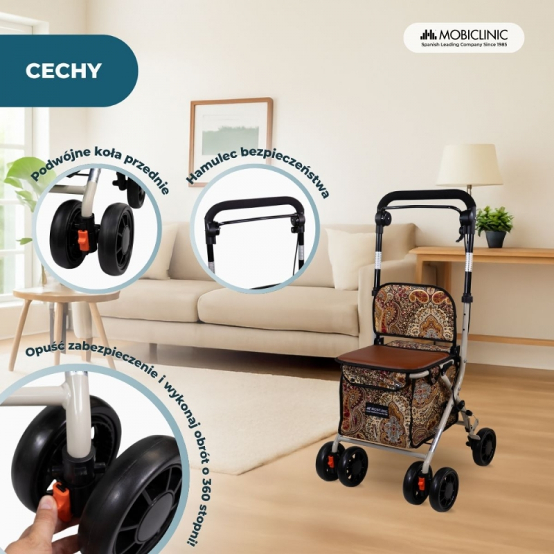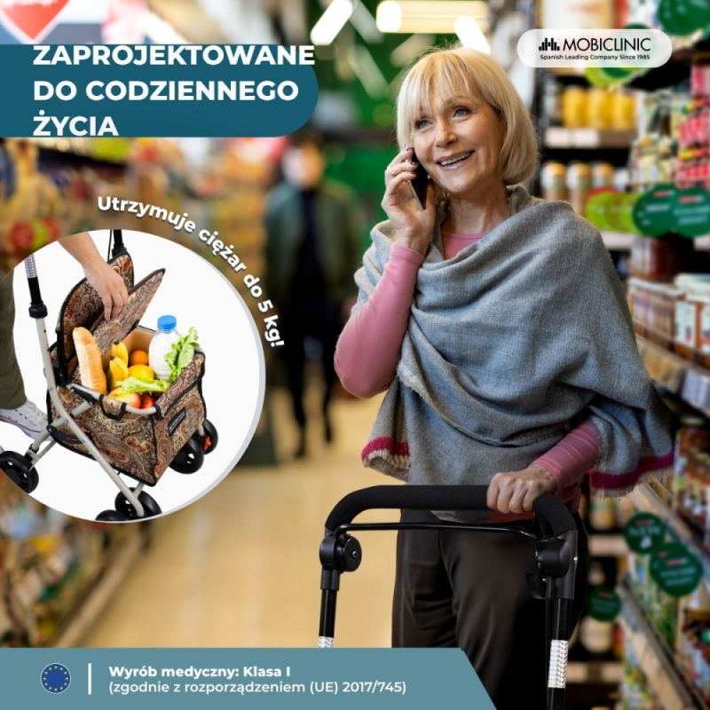 Chodzik do wózka sklepowego | 4 koła | Do 120 kg | Składany | Torba | Układ hamulcowy | Drukowany | Koloseum | Mobiclinic