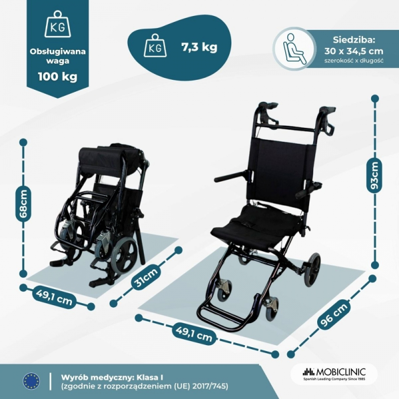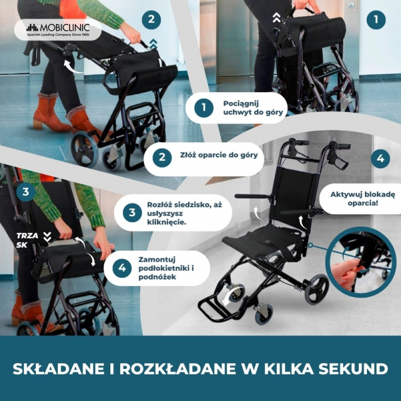 SKŁADANIE: składany wózek inwalidzki wykonany z aluminium, który umożliwia lekki ruch bez utraty stabilności w dowolnym momencie.
