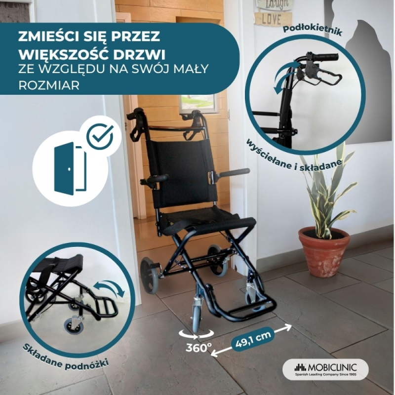 DRZWI I BAGAŻNIK : Ten wózek inwalidzki ma całkowitą szerokość 49,1 cm, więc może zmieścić się w drzwiach o standardowej szerokości 62,5 cm. Ponadto, ponieważ to złożone krzesło mierzy tylko 31 cm, można je przewozić w bagażniku pojazdu typu Ford Focus. Sprawdź wymiary drzwi i pojazdu, aby sprawdzić, czy Ci odpowiada.