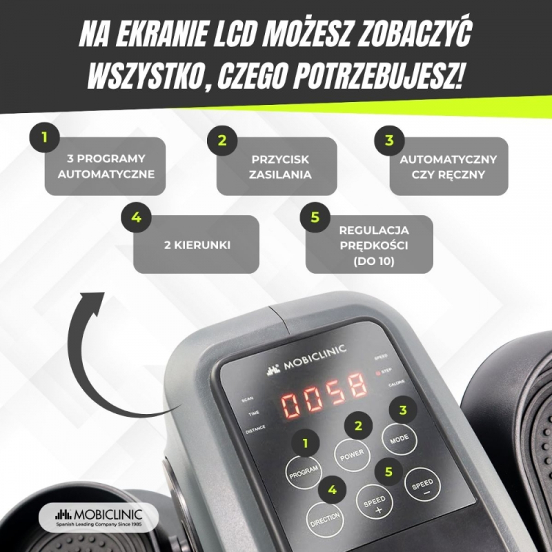 WIELOFUNKCYJNY EKRAN LCD: Możesz śledzić swoje postępy w treningu dzięki wbudowanemu ekranowi LCD, który wyświetla prędkość, czas, przebyty dystans i spalone kalorie. Ekran ten pozwala na monitorowanie postępów na mini orbitreku Veleta. W zestawie znajduje się również pilot zdalnego sterowania , który zapewnia wygodniejszą obsługę. Za pomocą pilota można włączać i wyłączać urządzenie, sterować prędkością, funkcjami, kierunkami i trybami, a także wybierać programy.